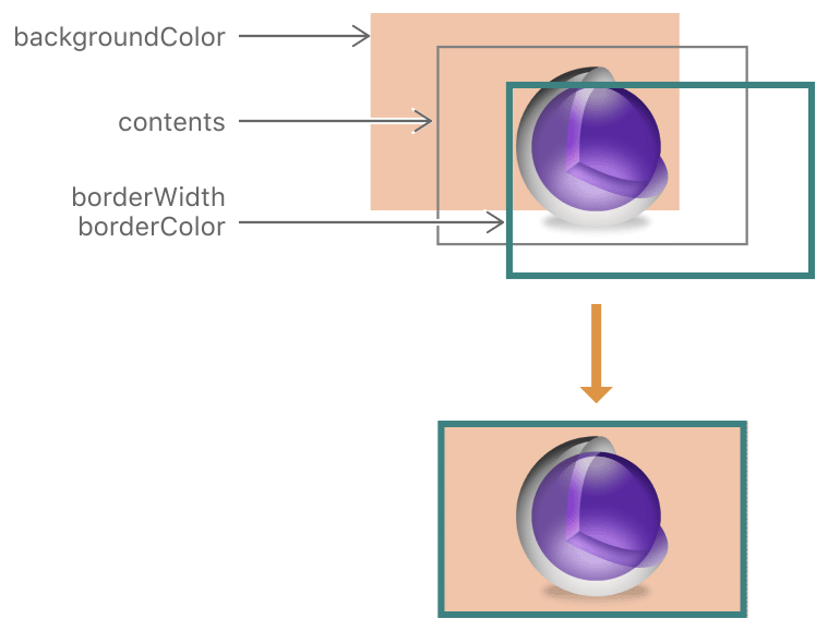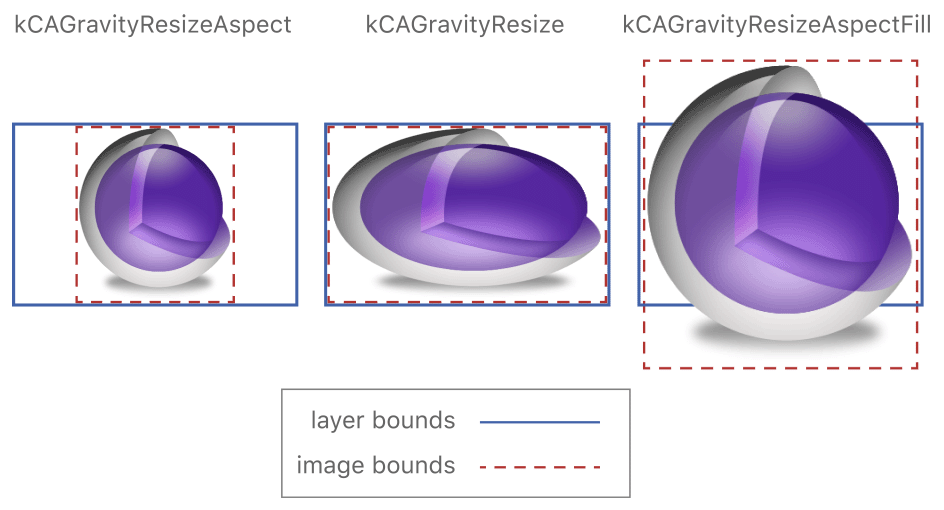 属性决定如何处理该图像以适应当前边界。默认情况下,如果图像大于或小于当前边界,图层对象将缩放图像以适合可用空间。如果图层边界的高宽比与图像的高宽比不同,则会导致图像失真。您可以使用contentsGravity