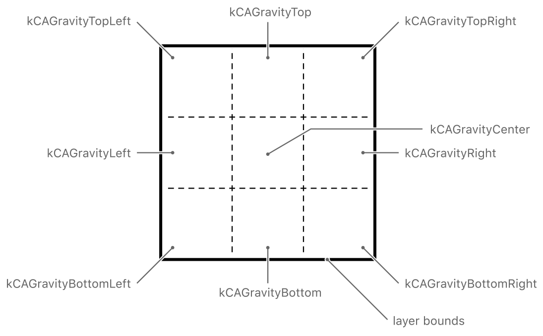 常量外,每个常量都会将图像固定到图层边界矩形的特定边或角点。kCAGravityCenter