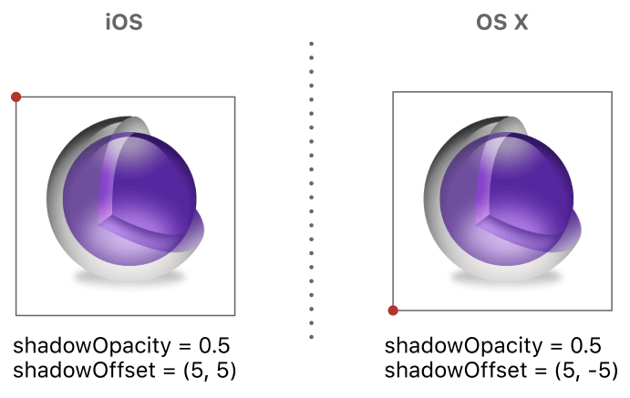 默认情况下,图层阴影的不透明度值设置为0,这有效隐藏了阴影。将不透明度更改为非零值会导致Core Animation绘制阴影。因为默认情况下,阴影直接位于图层下方,所以您可能还需要更改阴影的偏移量,然后才能看到阴影。不过请记住,您为阴影指定的偏移量是使用图层的本地坐标系来应用的,这在iOS和OS X上是不同的。